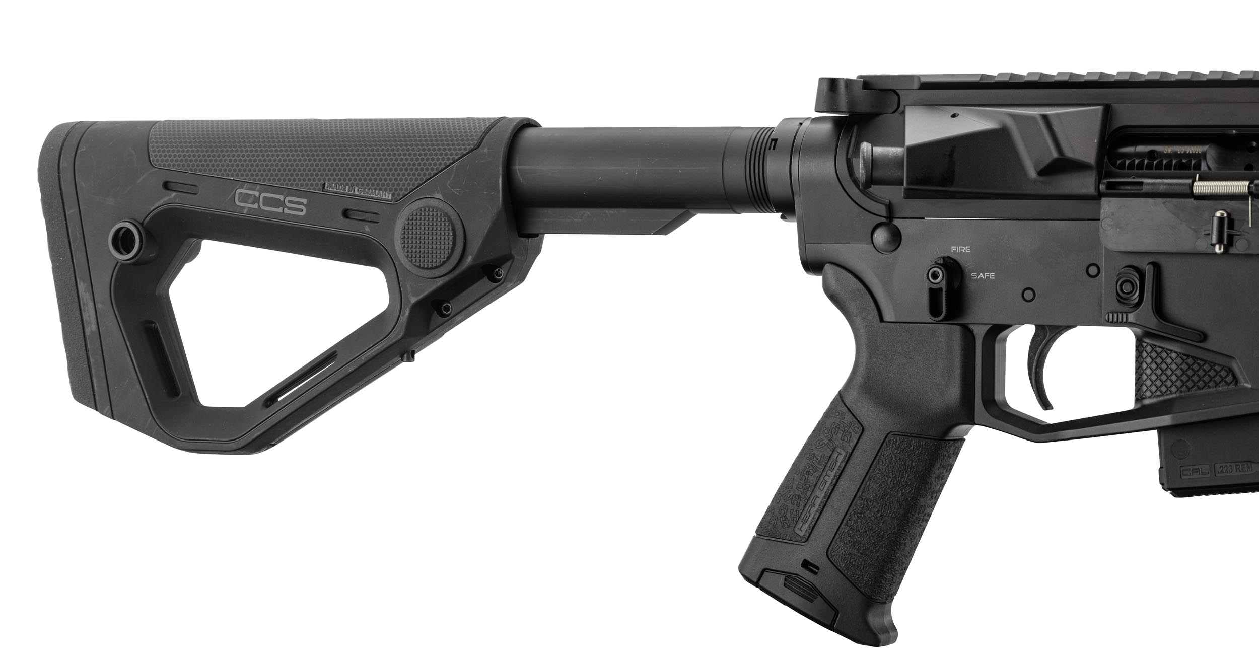 Le lower LS040 est équipée d’une crosse HERA ARMS CCS ajustable en longueur sur tube MILSPEC à verrouillage automatique et deux emplacements de bretelle type Quick Detach ainsi q’un rail picatinny amovible permettant l’utilisation d’un mono pied.