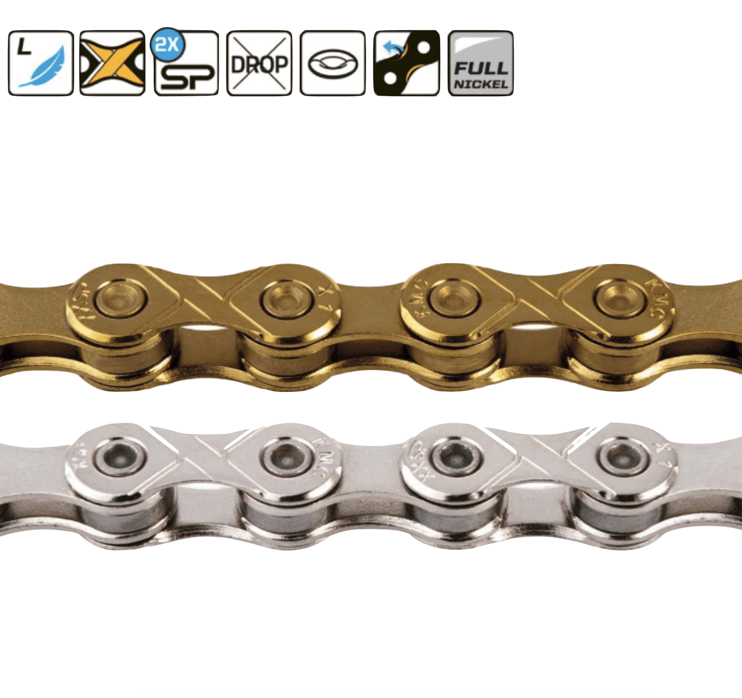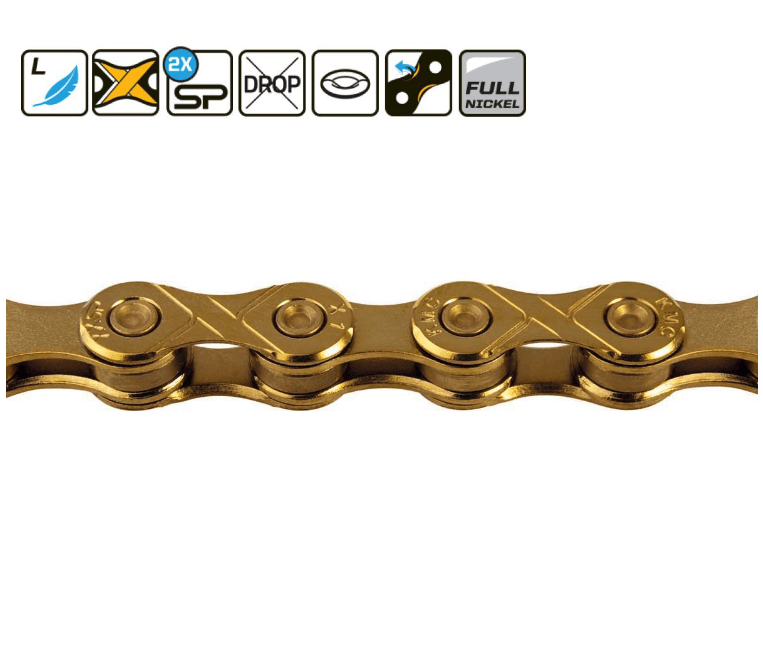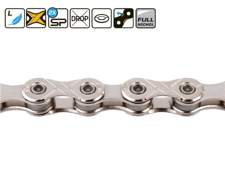 Les icônes vous aident à bien choisir le type de chaîne, certaines proposent un niveau de qualité supérieure grâce à des alliages ou traitements de surface plus résistants à l’usure ou à la corrosion. Pensez à bien vérifier l’usure de votre chaîne : une chaîne trop usée détériore les dents des plateaux et des pignons.
