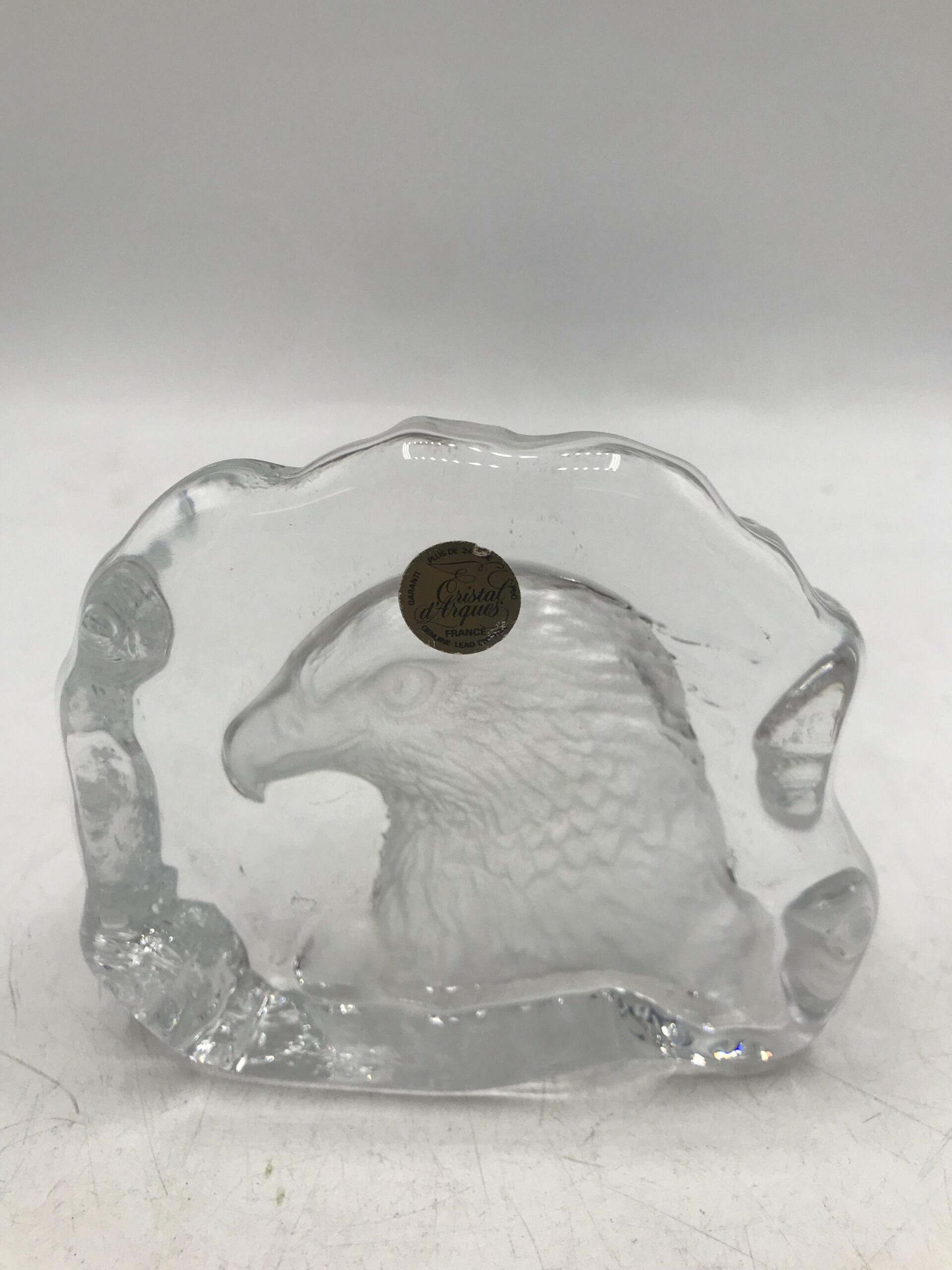 Duo de Cristal d’Arques. Amateurs de bibelots et décorations en Cristal vous allez craquer. Voici donc un duo explosif, il est composé d’un premier bloc ou à été sculpté une fleur, avec un aspect lisse celui ci inspire à la poésie et à la tranquillité. Le deuxième bloc lui et plus représenté par un fort caractère, représentant une tête d’aigle il a des aspérités plus irrégulières. Un duo qui marche à merveille ensemble d’un coté le doux et de l’autre la force. Des œuvres signées Cristal d’Arques. Elles sont en très bon état, prêtent à trôner sur vos meubles. Pour apporter une touche de pureté dans votre intérieur. Des pièces iconiques qui trouveront vite leur place. Fans de cristal vous allez être sous leur charme.