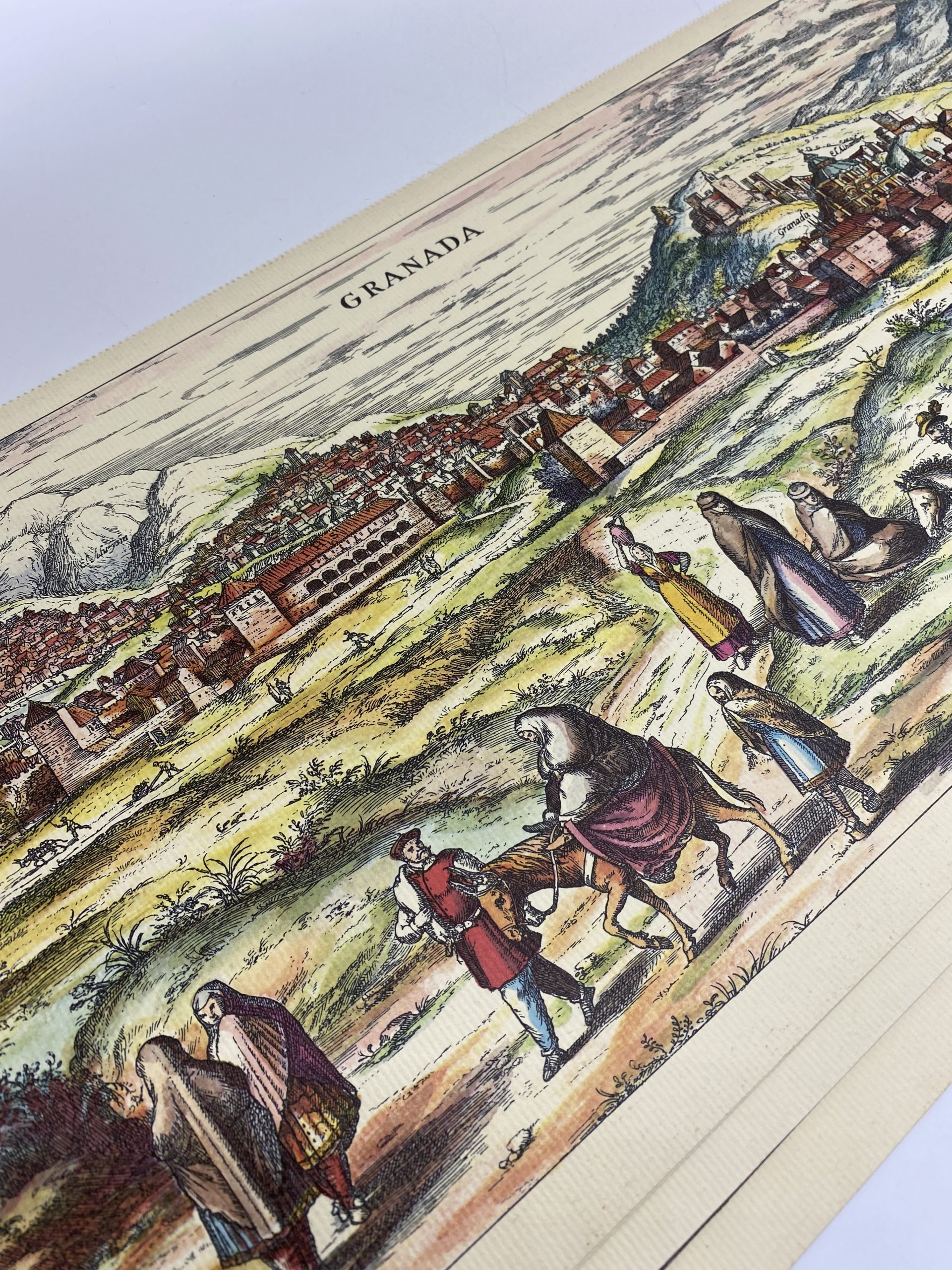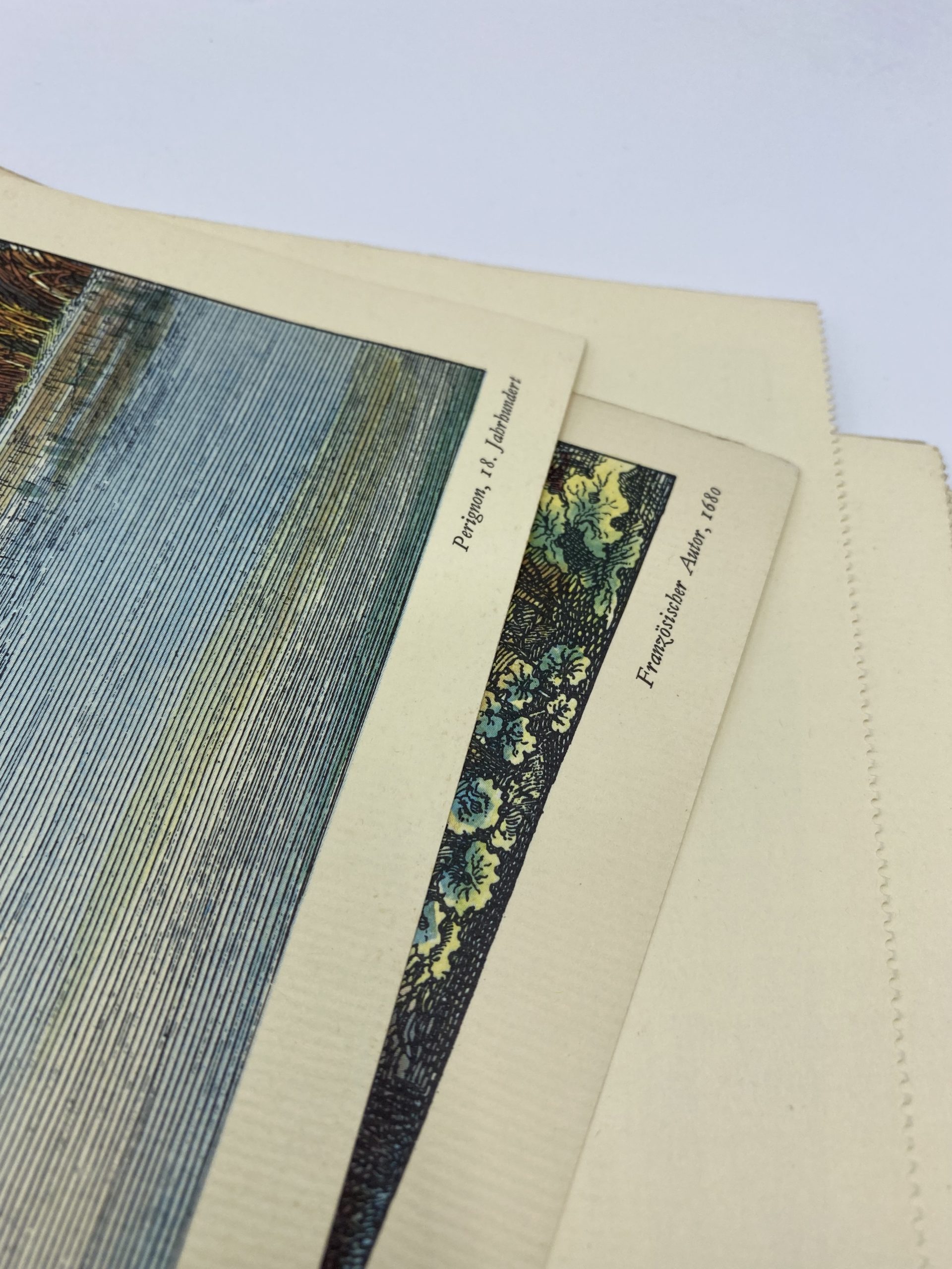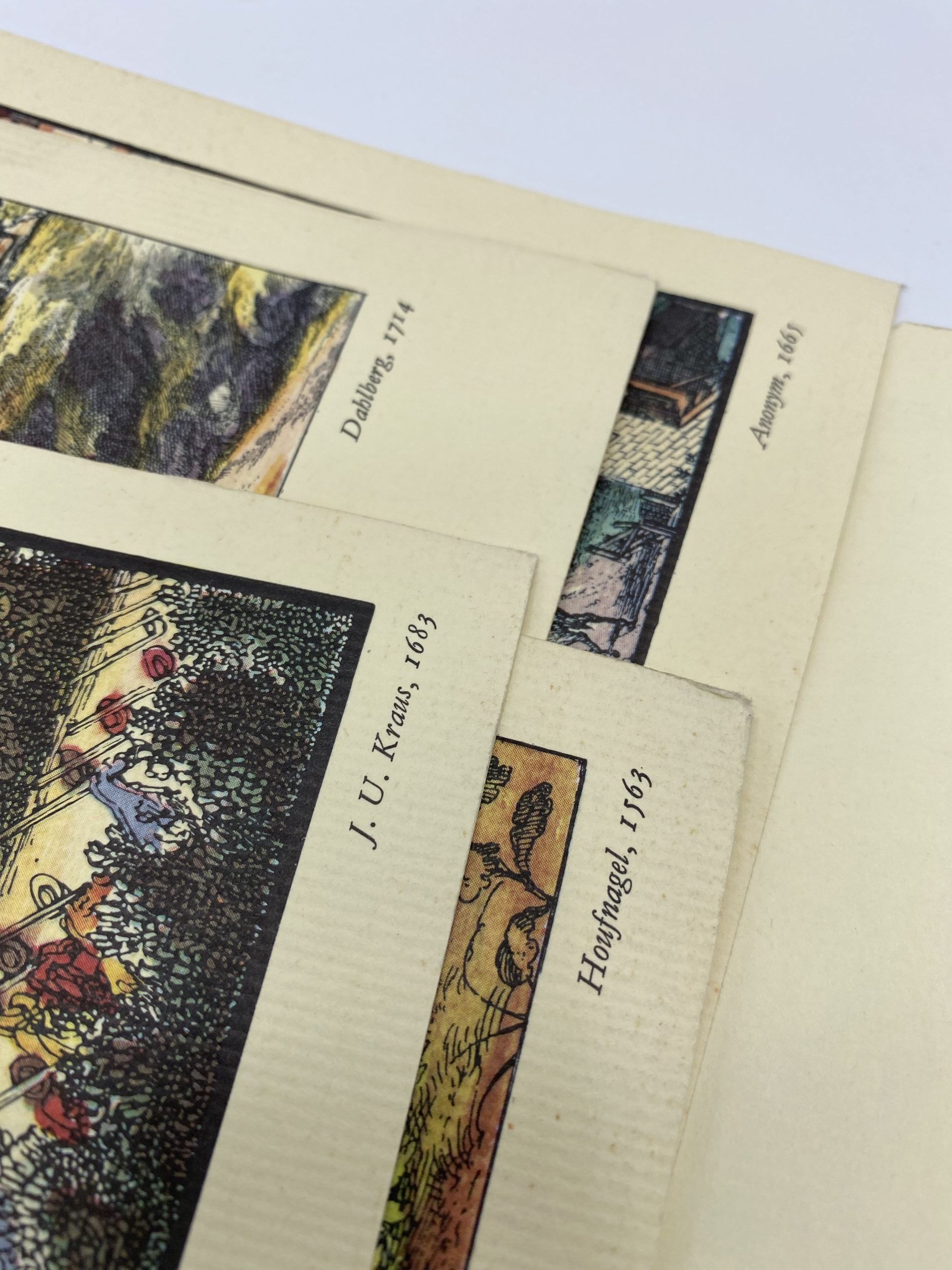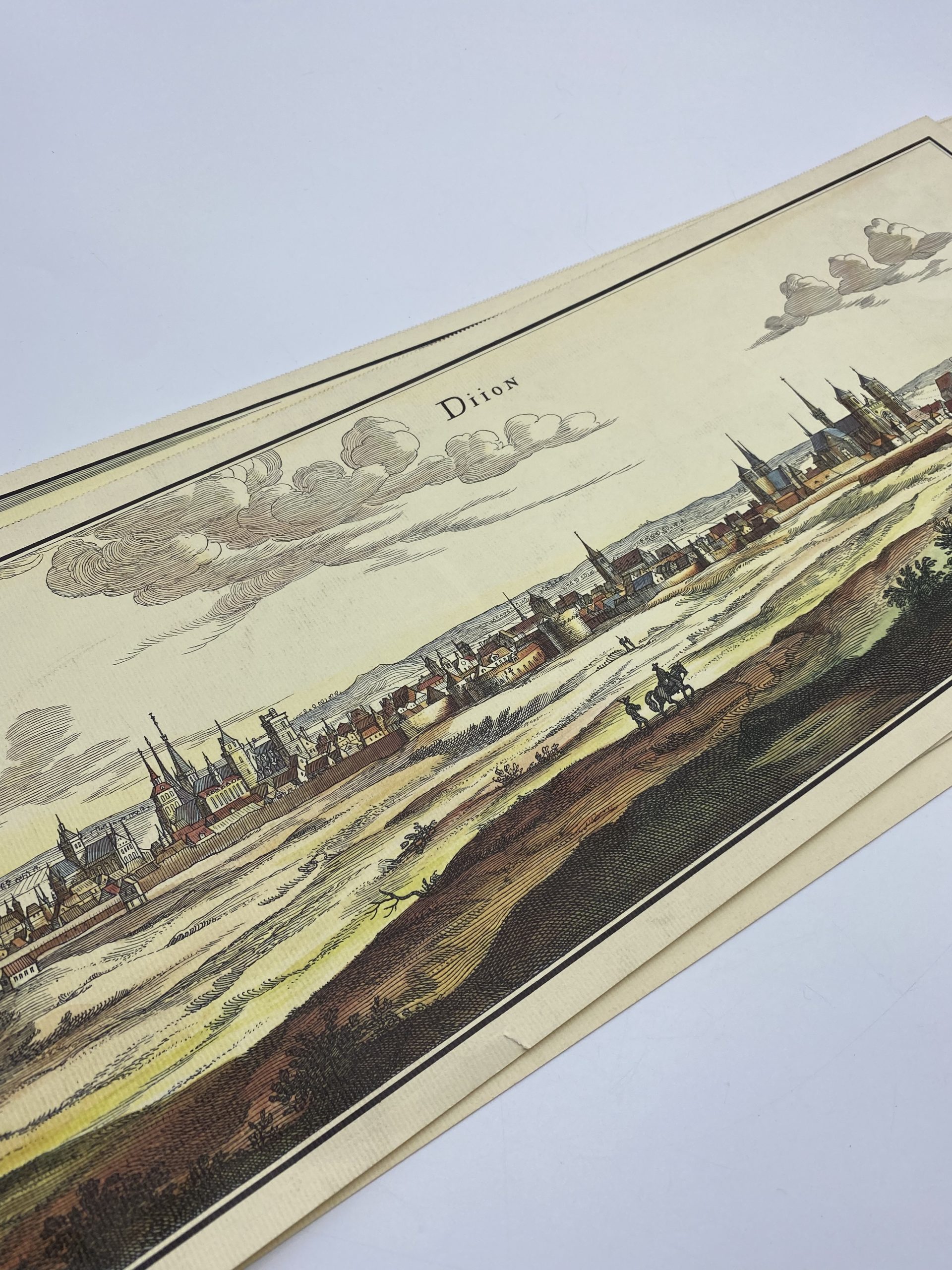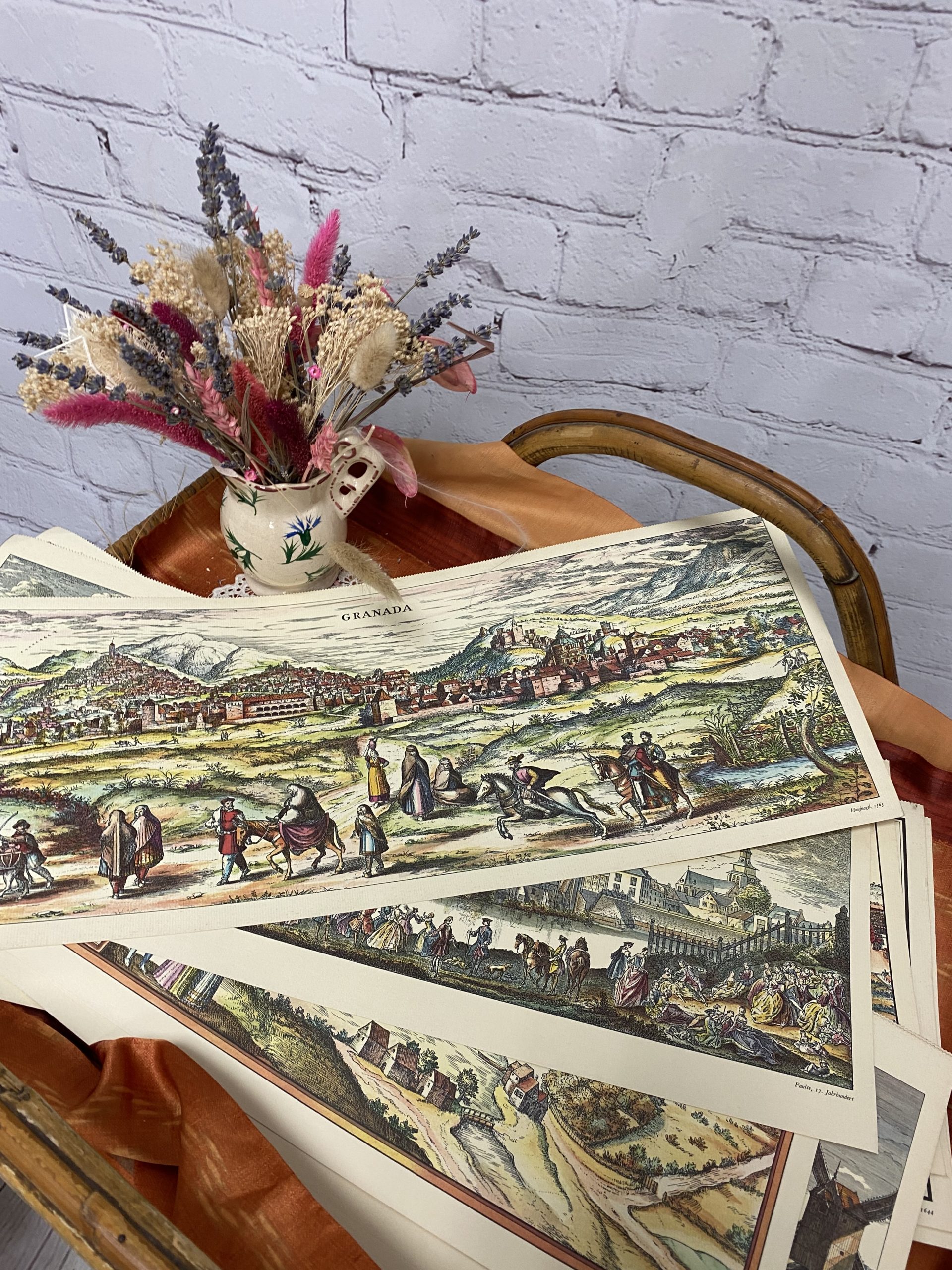 On adore ce joli lot qui se compose de 13 reproductions de gravures et estampes anciennes en couleur. Sur un beau papier gaufré de couleur beige, les illustrations représentent des cartes te des paysages de villes ou de villages datées de 1563 à 1714. Parmi les villes et villages on retrouve Grenade, le Château de Tervueren, Birmingham, Zurich, Mayence, Dijon, Ulm ou encore Stockholm. En bon état général, quelques traces d’usure sont à prévoir sur certains des angles des reproduction. A encadrer ou à accrocher au mur, elles feront penser aux vielles mappemondes t aux cartes anciennes !
