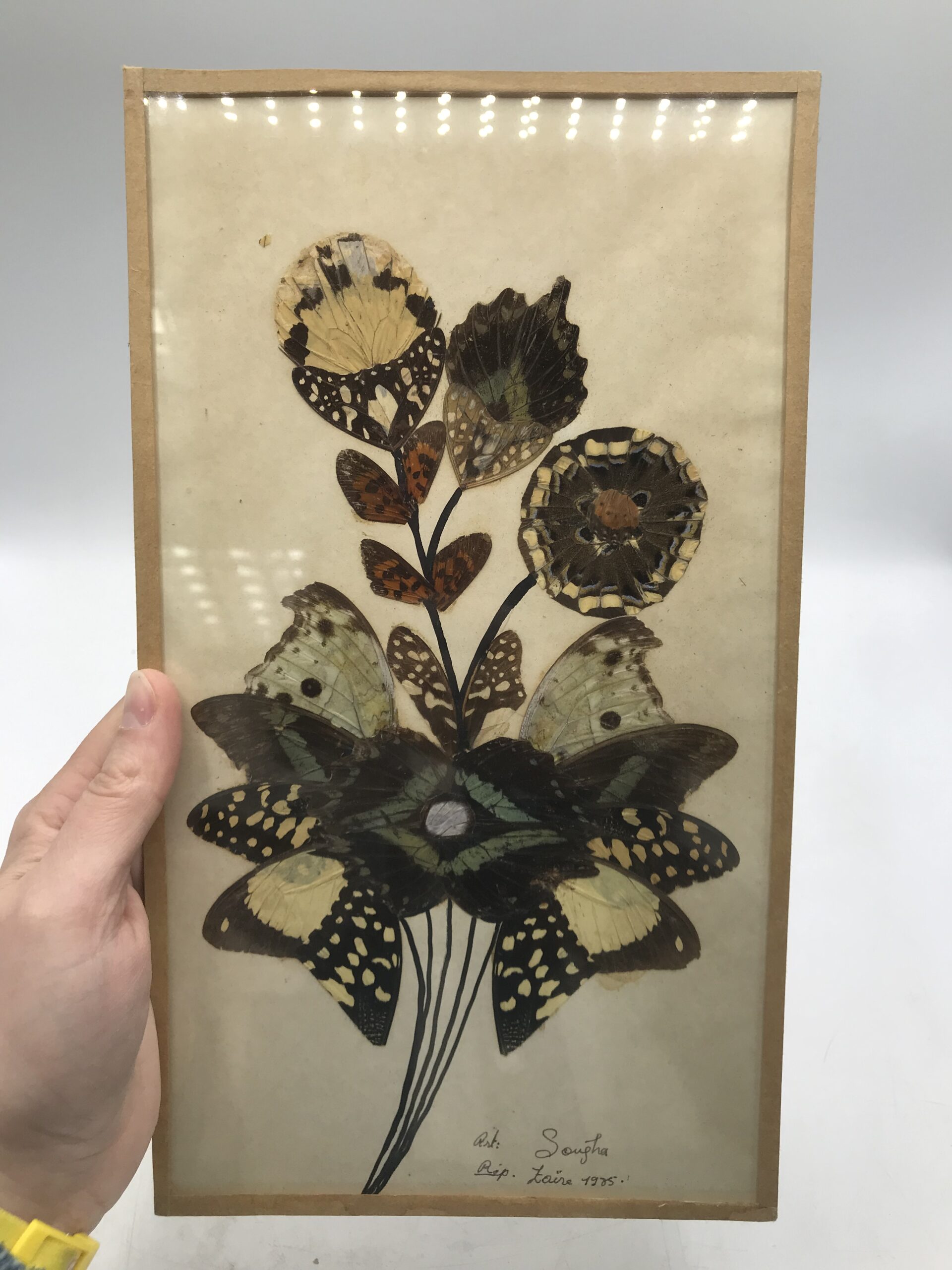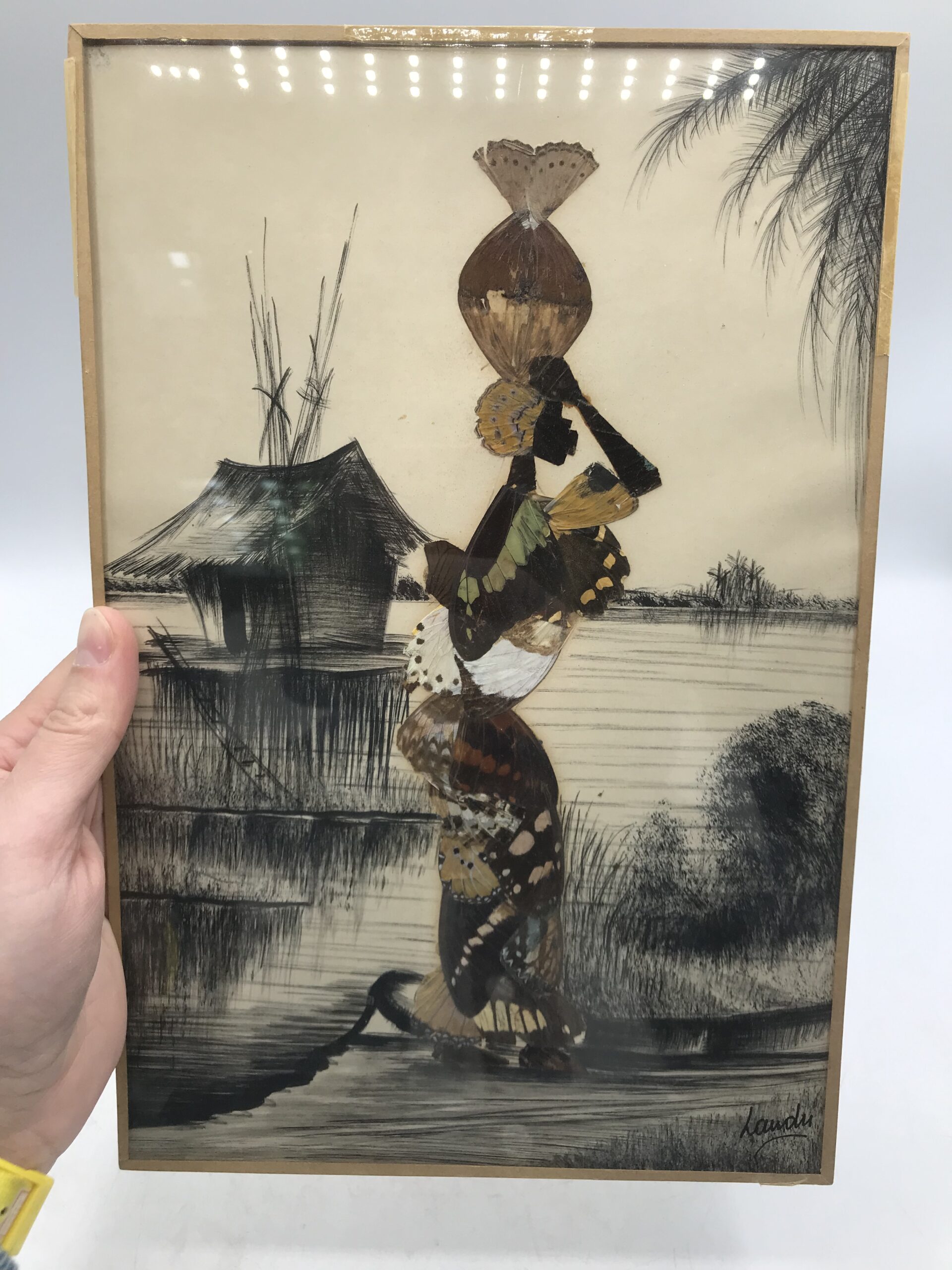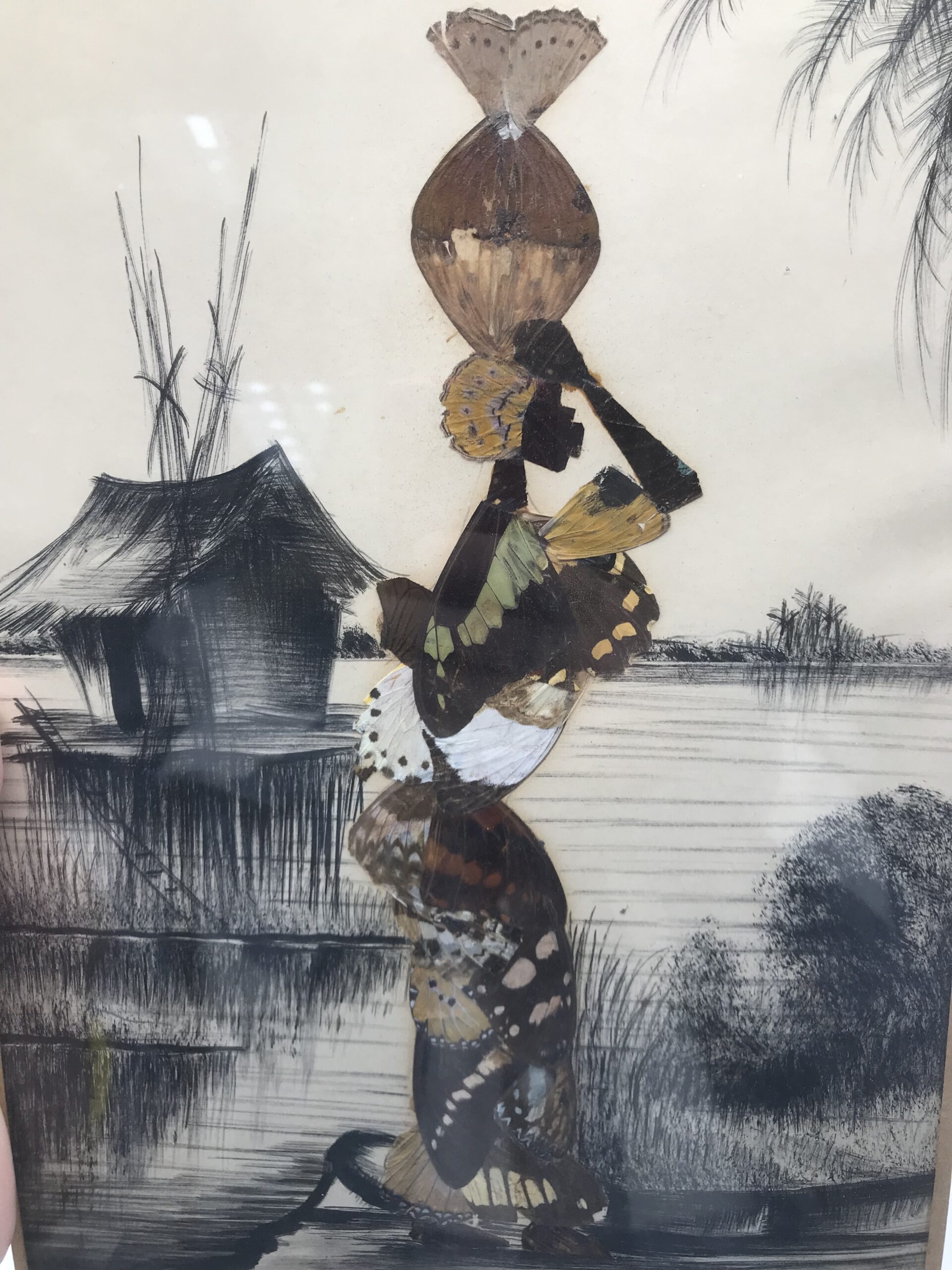 Lot de quatre compositions à base d’ailes de papillons origine Afrique. Pour les amateurs de voyage et de décoration exotique cet lot est fait pour vous. Il est composé d’une première composition qui représente un bouquet de fleurs. La deuxième composition représente un oiseaux perché sur une branche. La troisième composition représente une femme en tenue traditionnelle, la taille de ces trois premiers tableaux est de 30 cm de hauteur par 17 de longueur. Pour finir la quatrième composition représente une femme en habits traditionnels portant un vase sur sa tête. Sa taille est de 30 cm de hauteur par 20 cm de longueur. Joli ensemble qui peut facilement habiller un mur.