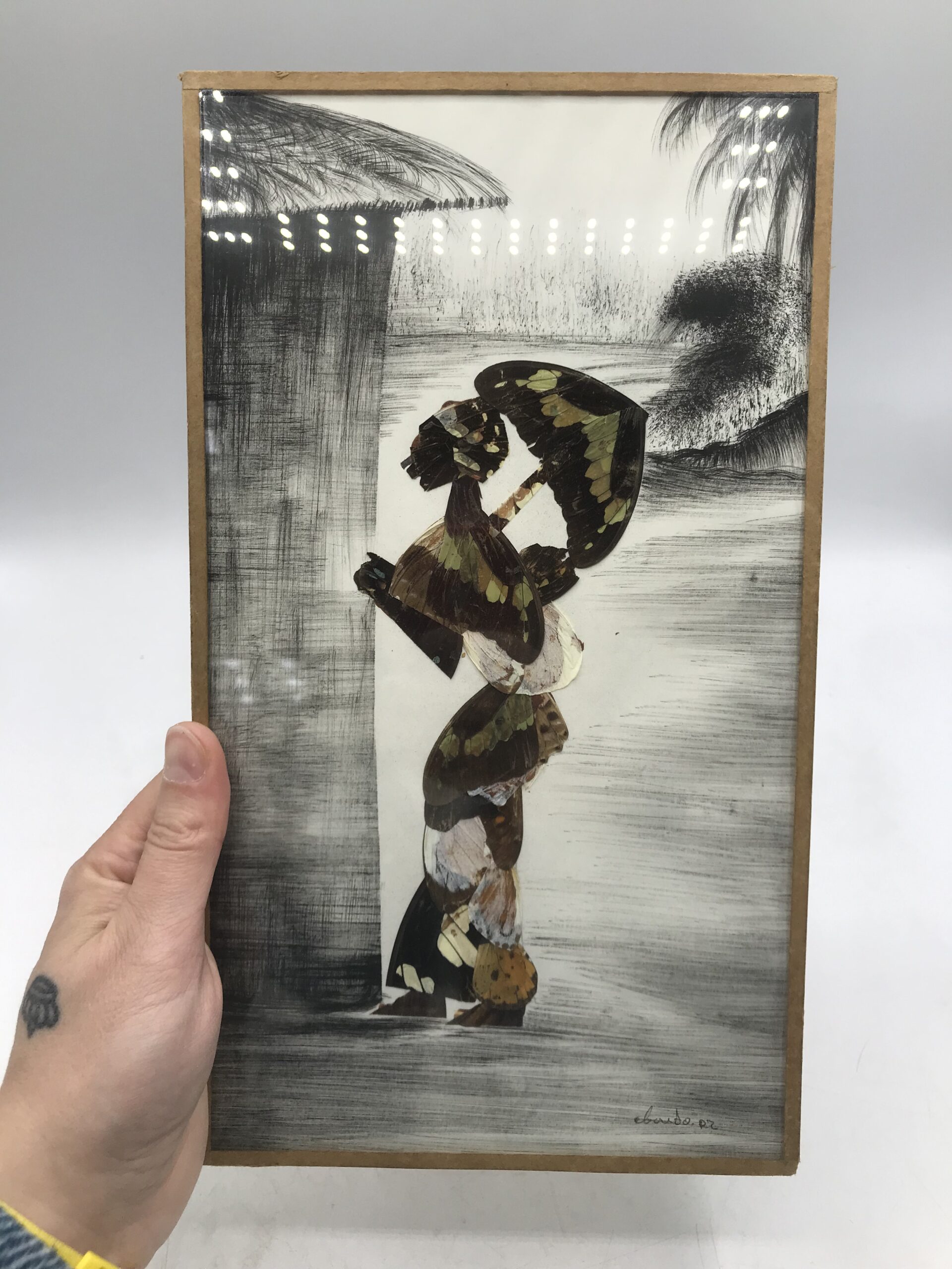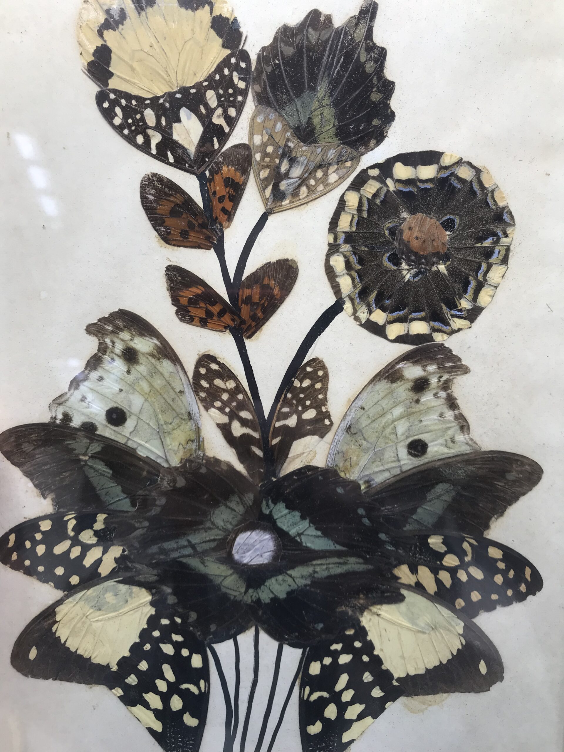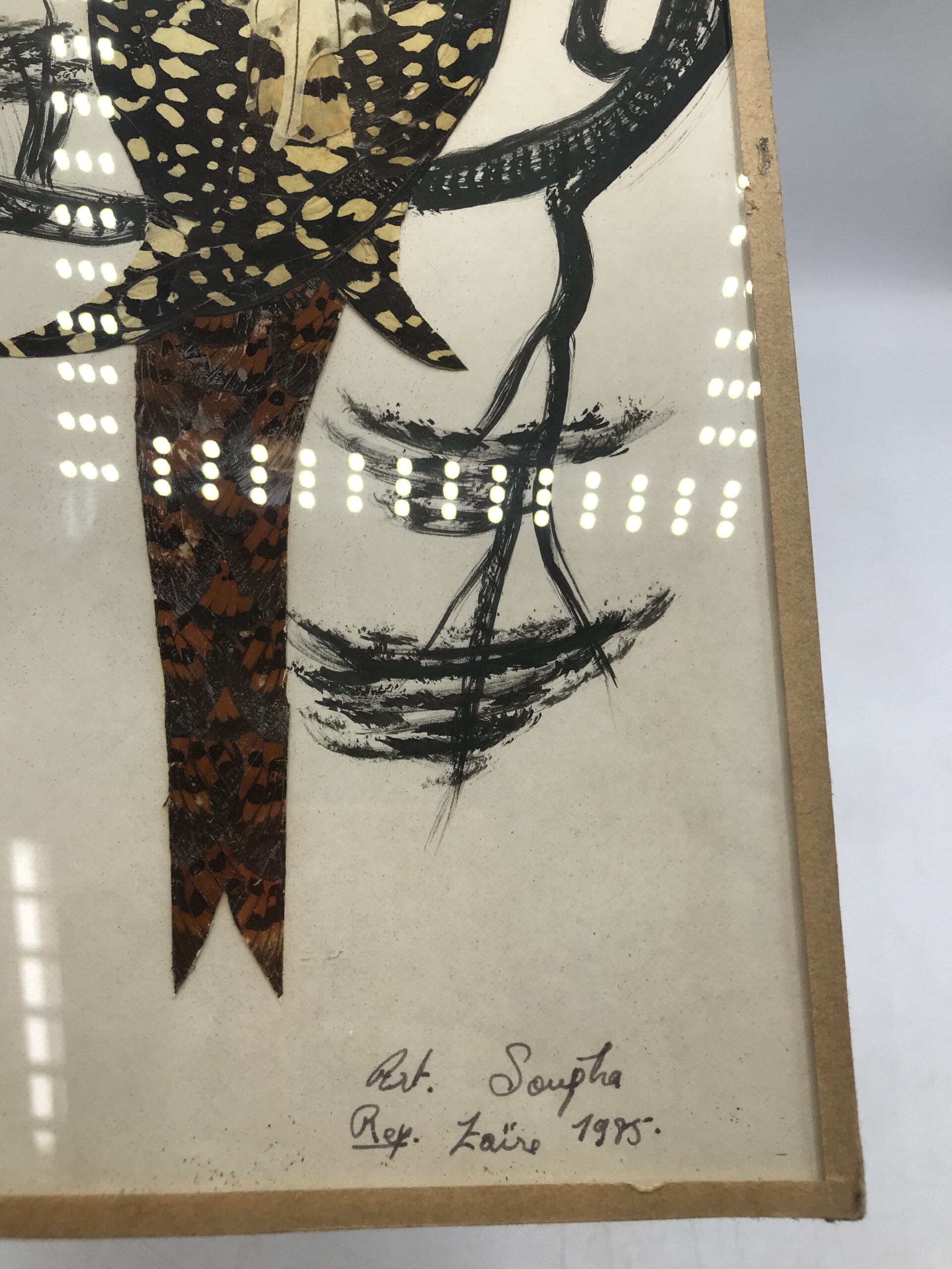 Lot de quatre compositions à base d’ailes de papillons origine Afrique. Pour les amateurs de voyage et de décoration exotique cet lot est fait pour vous. Il est composé d’une première composition qui représente un bouquet de fleurs. La deuxième composition représente un oiseaux perché sur une branche. La troisième composition représente une femme en tenue traditionnelle, la taille de ces trois premiers tableaux est de 30 cm de hauteur par 17 de longueur. Pour finir la quatrième composition représente une femme en habits traditionnels portant un vase sur sa tête. Sa taille est de 30 cm de hauteur par 20 cm de longueur. Joli ensemble qui peut facilement habiller un mur.