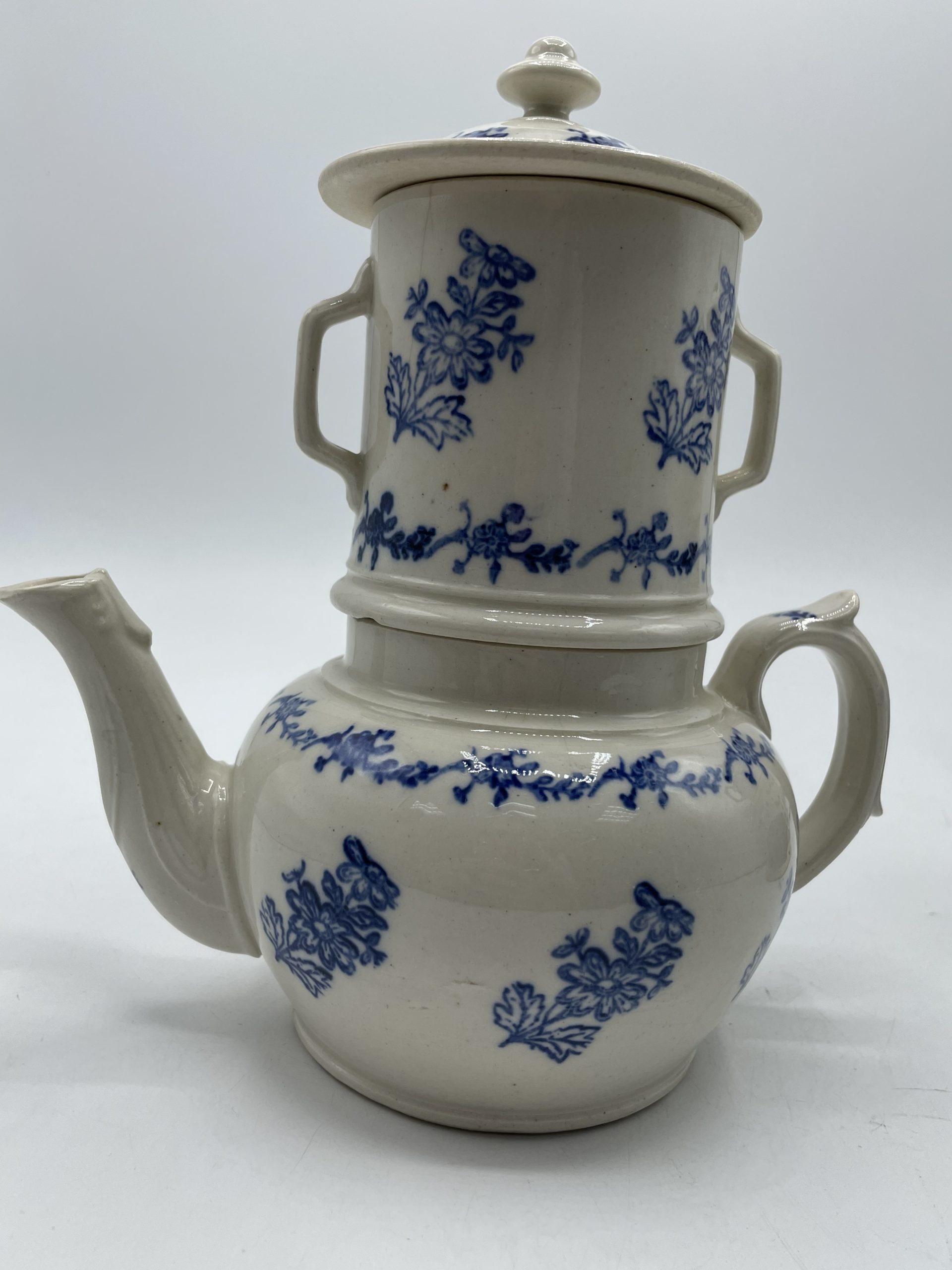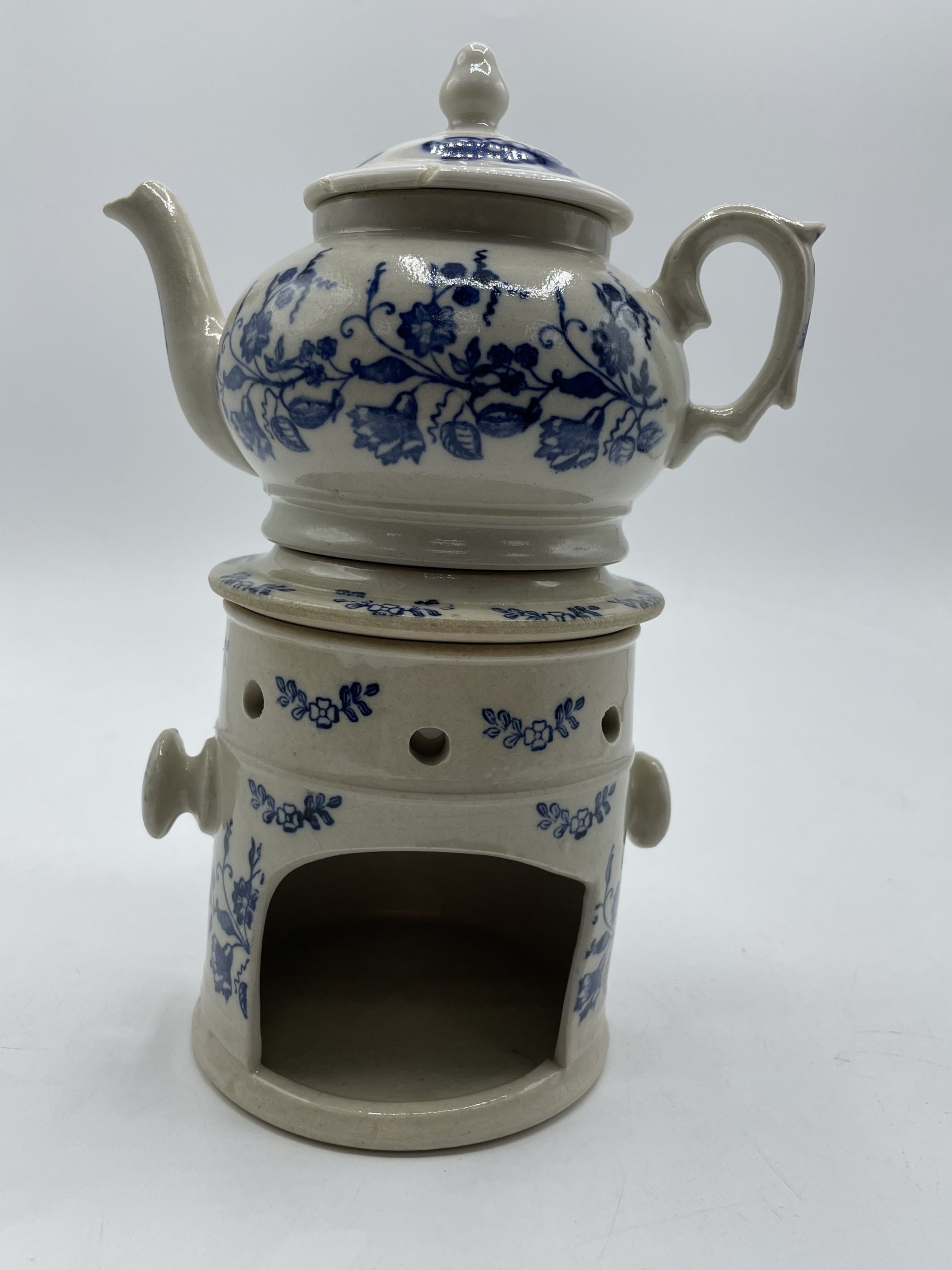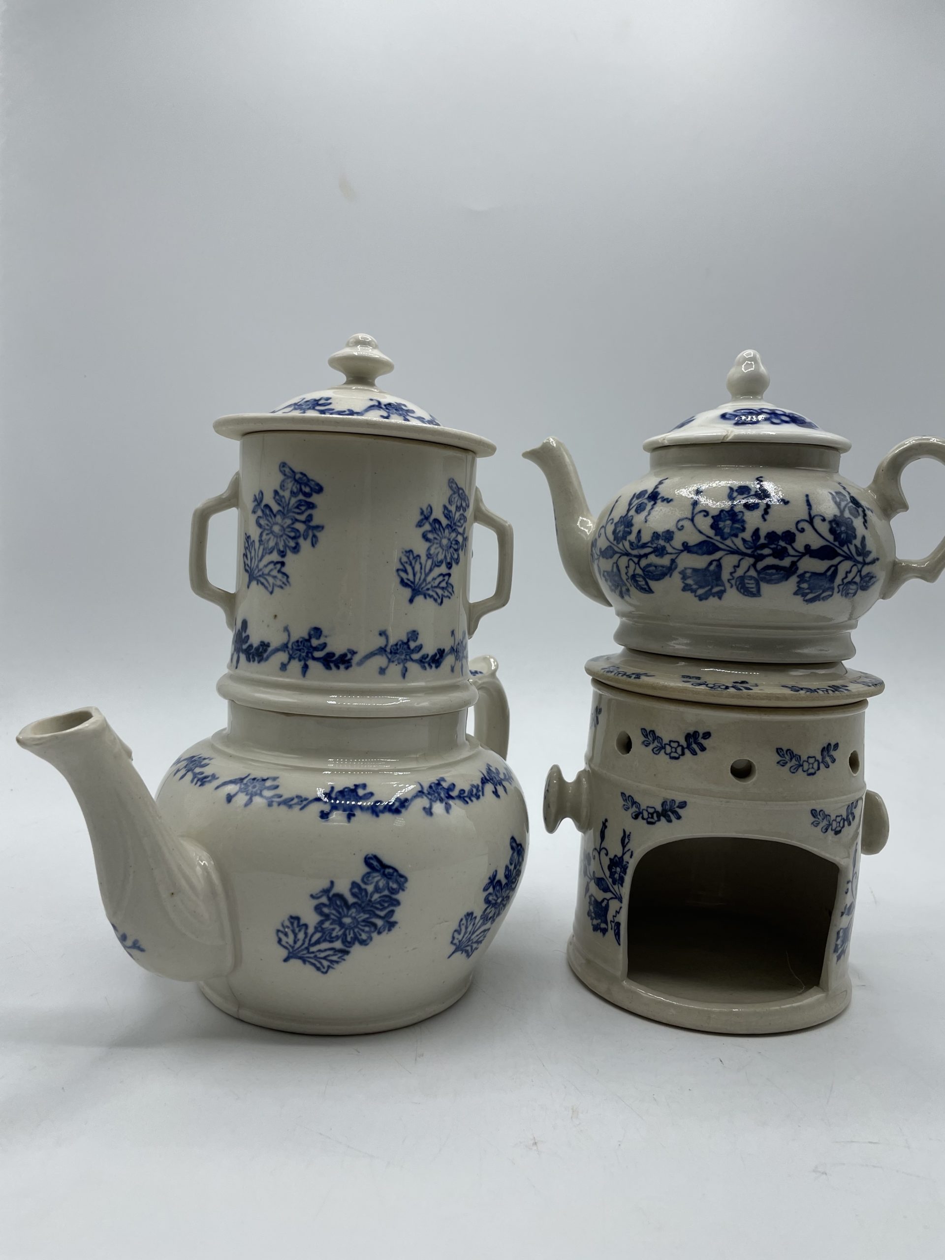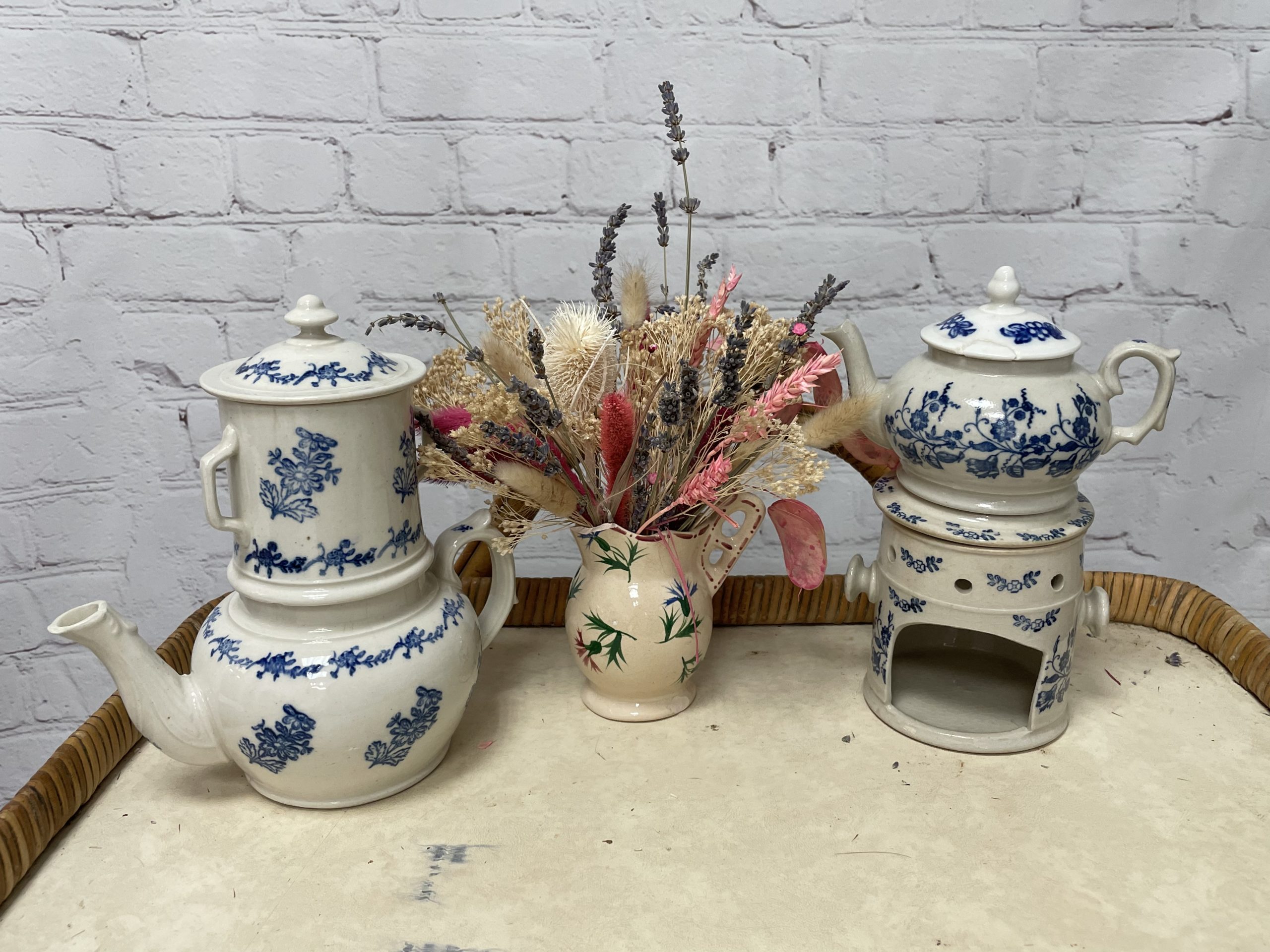 Alerte coup de cœur maximale pour ce superbe service à thé qui se compose d’une grande théière et de son filtre et d’une petite théière avec son réchaud. En terre de fonte Saint Vallier aussi appelé grès dit bleu de Saint Uze, ce magnifique service a une belle couleur entre le beige et le gris et il est décoré de motifs de petites fleurs bleues. Vintage, des marques d’usure sont à prévoir ainsi qu’un petit éclat sur le couvercle de la petite théière qui a été recollé (cf photos), jolies marques du temps passé. A la fois vintage et romantique, ce joli service sera parfait pour un teatime esprit shabby chic ou cottage anglais !