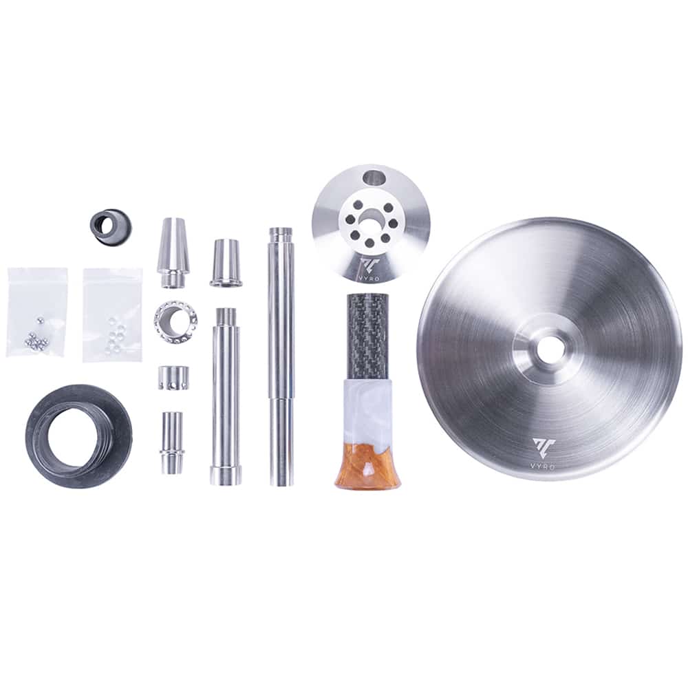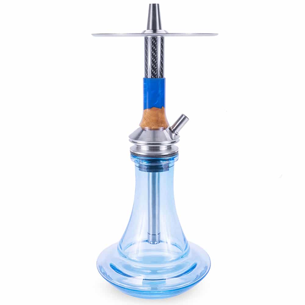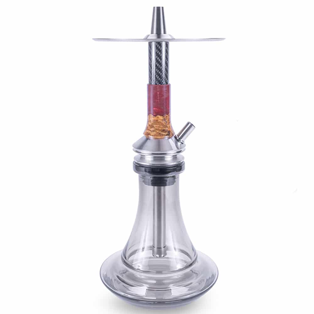 Pour commencer la chicha VYRO Penta est un petit narguilé compact (environ 39 cm) en acier inoxydable V2A, véritable carbone, résine époxy et bois.